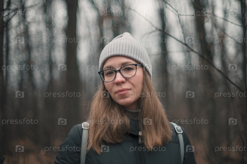 Женщина в теплой одежде в осеннем лесу