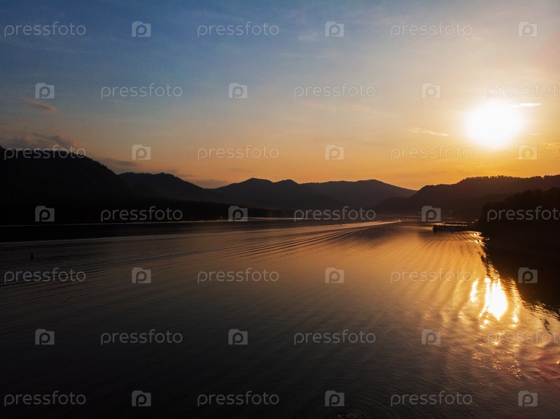 Закат на Телецком озере в горах Алтая, Сибирь, Россия. Снято с дрона