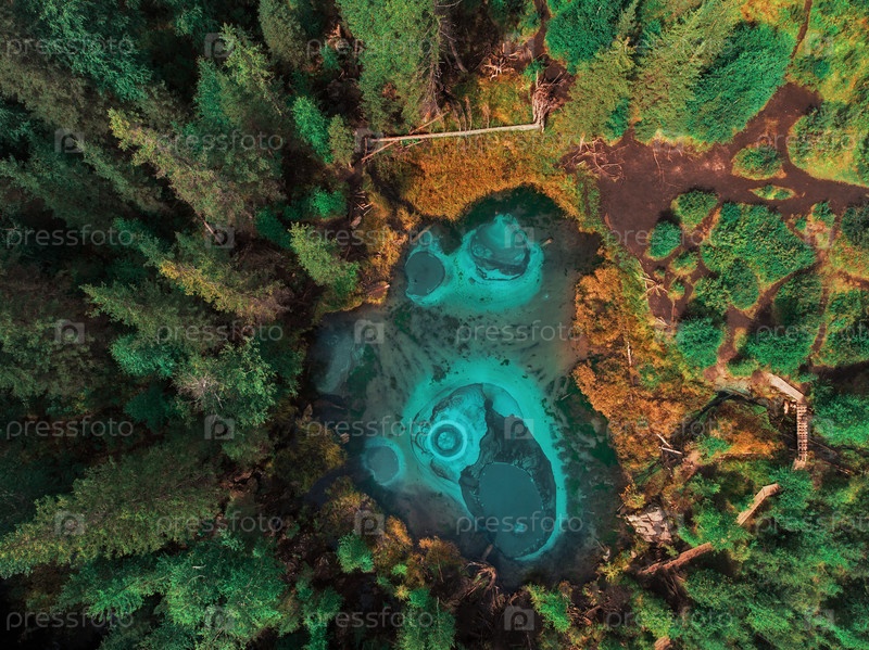 Красивое Гейзерное (голубое, серебристое) озеро с термальными источниками, которые периодически выбрасывают из земли голубую глину и ил. Вид с воздуха с дрона. Акташ, Алтайские горы, Россия