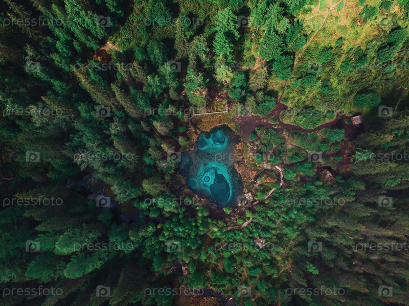 Красивое Гейзерное (голубое, серебристое) озеро с термальными источниками, которые периодически выбрасывают из земли голубую глину и ил. Вид с воздуха с дрона. Акташ, Алтайские горы, Россия
