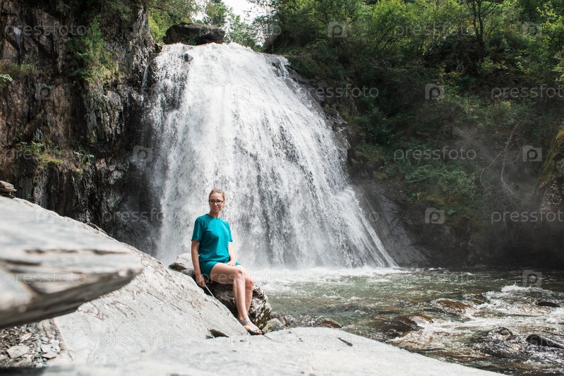 Женщина у водопада Корбу на Телецком озере осенью в Горном Алтае