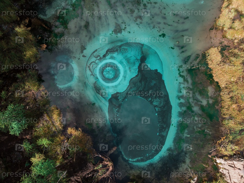 Красивое Гейзерное (голубое, серебристое) озеро с термальными источниками, которые периодически выбрасывают из земли голубую глину и ил. Вид с воздуха с дрона. Акташ, Алтайские горы, Россия