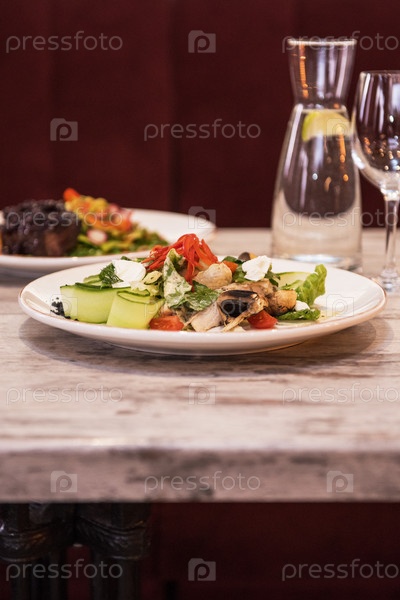 Салат из грибов и овощей на столе в ресторане