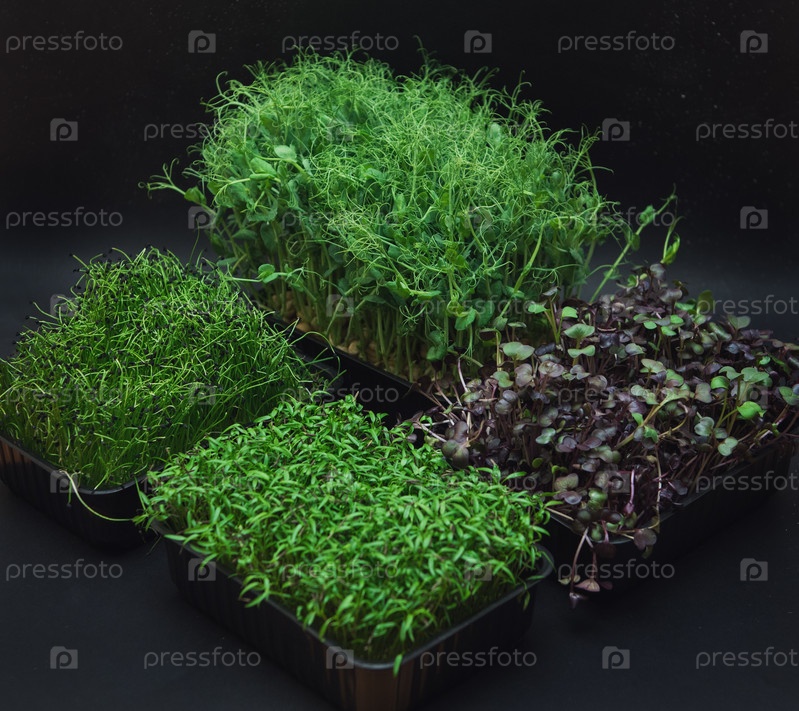 Микрозелень ростки редиса, амаранта, гороха, свеклы на черном фоне. Концепция суперфуда и здоровой органической пищи