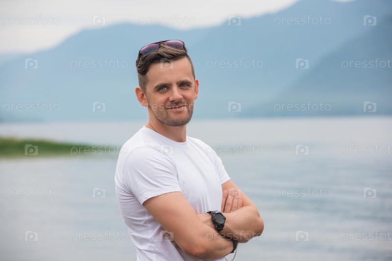 Мужской портрет на Телецком озере в горах Алтая, Сибирь, Россия. Красота летнего дня