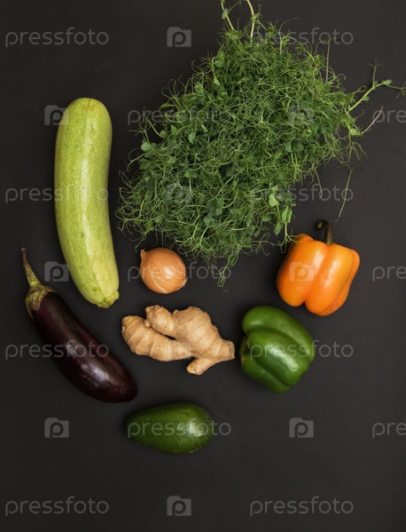Свежие овощи и микрозелень прорастают на черном фоне. Концепция суперфуда и здоровой органической пищи
