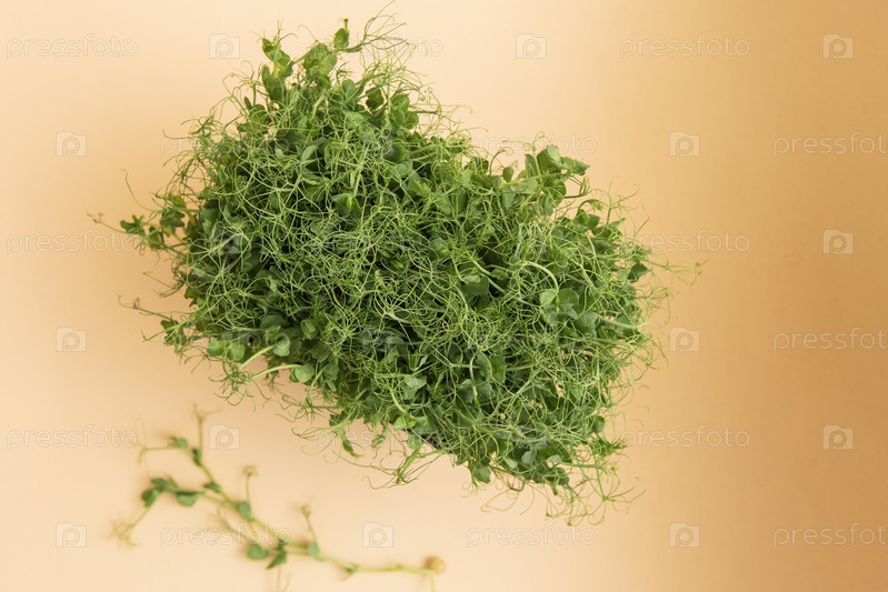 Микрозелень прорастает горох на бежевом фоне. Концепция суперфуда и здоровой органической пищи