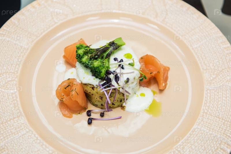 Картофельная запеканка с брокколи, белым соусом и лососем, украшенная микрозеленью и ростками редиса