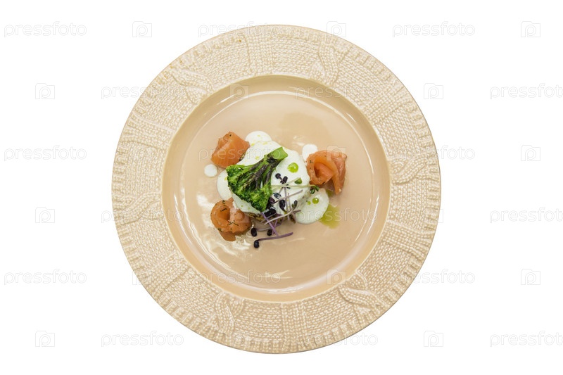 Картофельная запеканка с брокколи, белым соусом и лососем, украшенная микрозеленью и ростками редиса