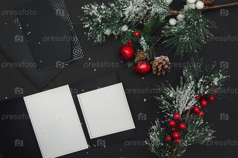 Рождественский минимальный макет - красный рождественский шар и елка на черном фоне. Горизонтальная композиция с пустой бумажной заготовкой. Плоская планировка, вид сверху