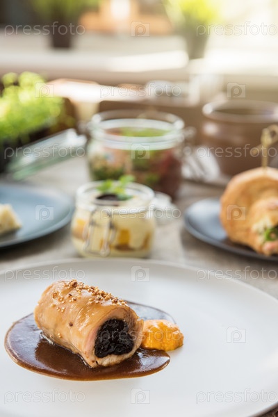Различные вкусные блюда на столе в ресторане, мясной рулет на тарелке
