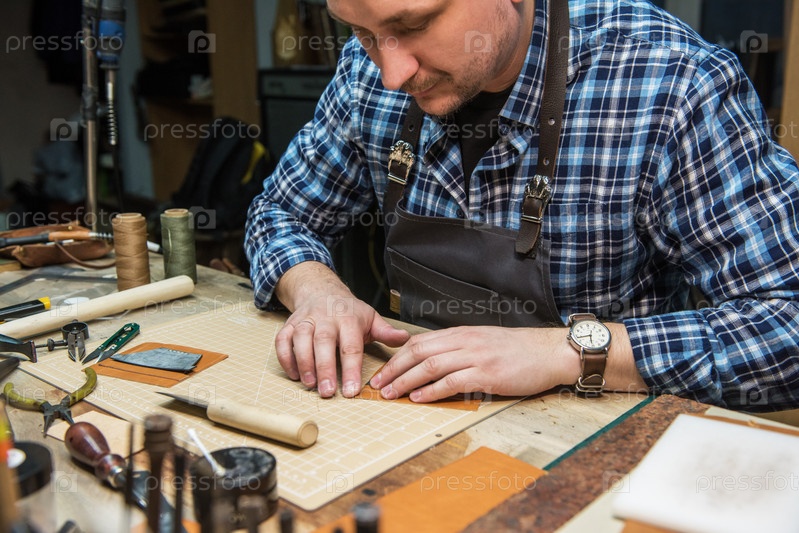 Человек, работающий с кожаным текстилем в мастерской. Мастер режет кожу. Концепция ручного ремесленного производства изделий из кожи