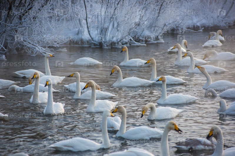 Лебеди-кликуны плавают в озере, Алтай, Россия