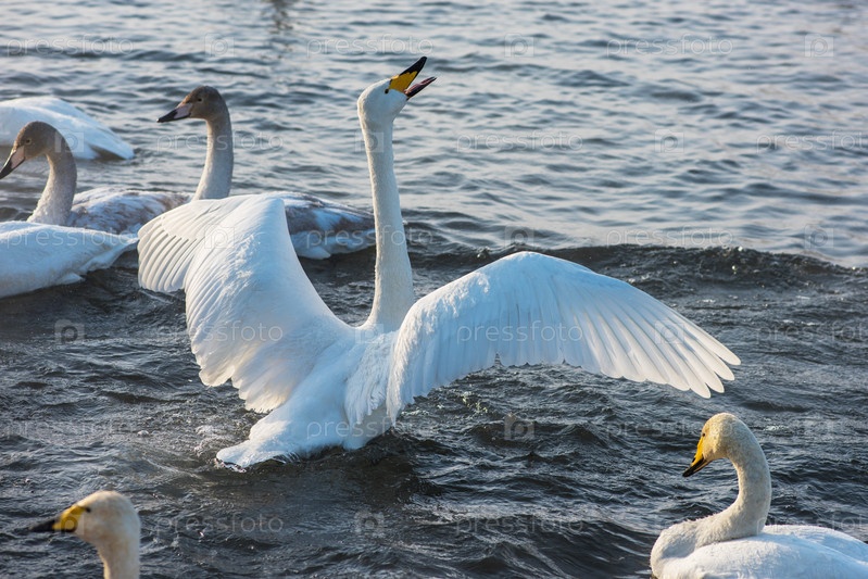 Лебеди-кликуны плавают в озере, Алтай, Россия