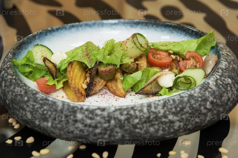 Салат с жареным картофелем, салатом, маринованными огурцами и помидорами на декоративной тарелке
