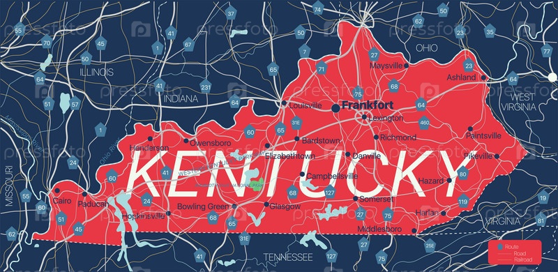 Подробная редактируемая карта штата Кентукки с городами и поселениями, географическими объектами, дорогами, железными дорогами, межштатными и автомагистралями США. векторный файл EPS-10, трендовая цветовая схема