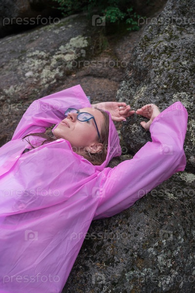 Женщина в розовом плаще наслаждается природой