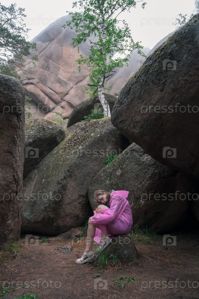 Женщина в розовом плаще в каменистом лесу. Национальный парк в Красноярском крае