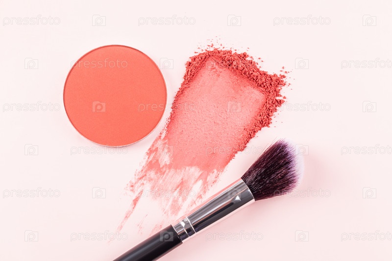 Мазки розовых сухих румян, круглый блок розовых румян, кисть для макияжа на светлом фоне. Концепция декоративной косметики. Макияж