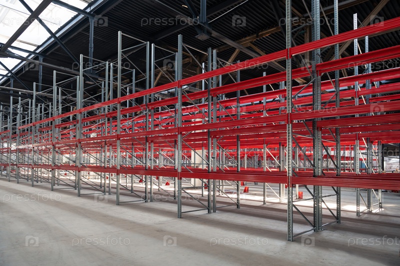 Склад с пустыми высокими стеллажами для поддонов, система стеллажей