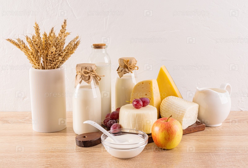 Красивый натюрморт в белых тонах с традиционными молочными продуктами к празднику Шавуот и символом праздника колосьями пшеницы в вазе