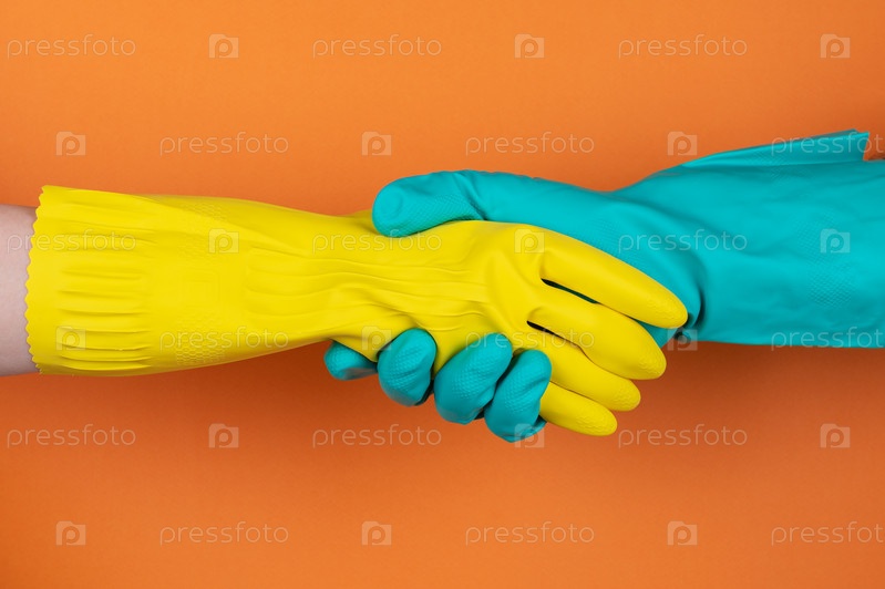 Две руки в резиновых перчатках желтого и синего цветов пожимают друг другу руки на ярко-оранжевом фоне, символизируя сотрудничество и гигиену