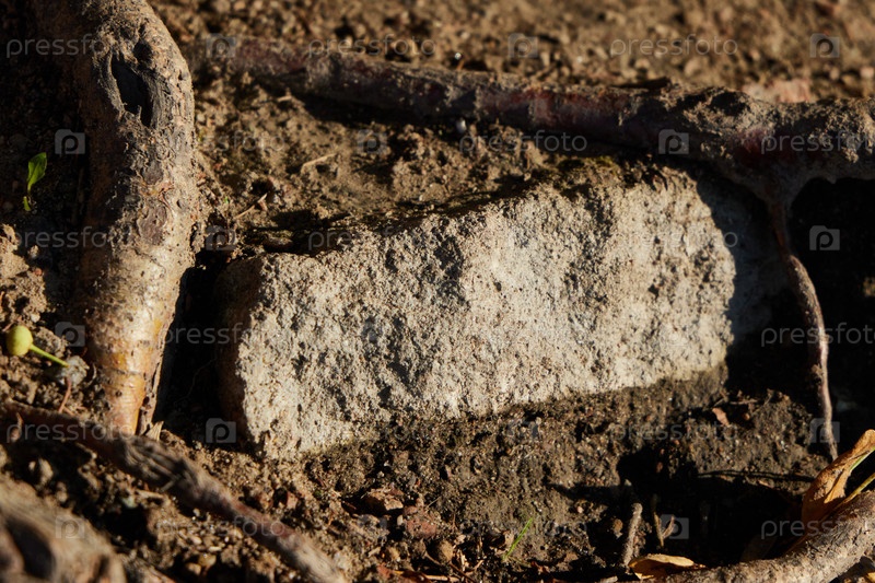 Сложная текстура камня, вросшего в подлесок, окруженного корнями и почвой