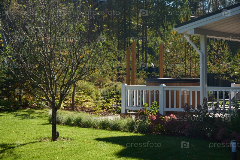 Тихий и красивый задний двор с зеленой лужайкой, окруженной белой террасой