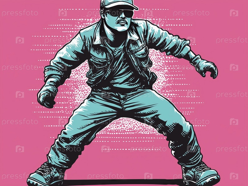 Иллюстрация в стиле ретро, изображающая скейтбордиста в действии на розовом фоне