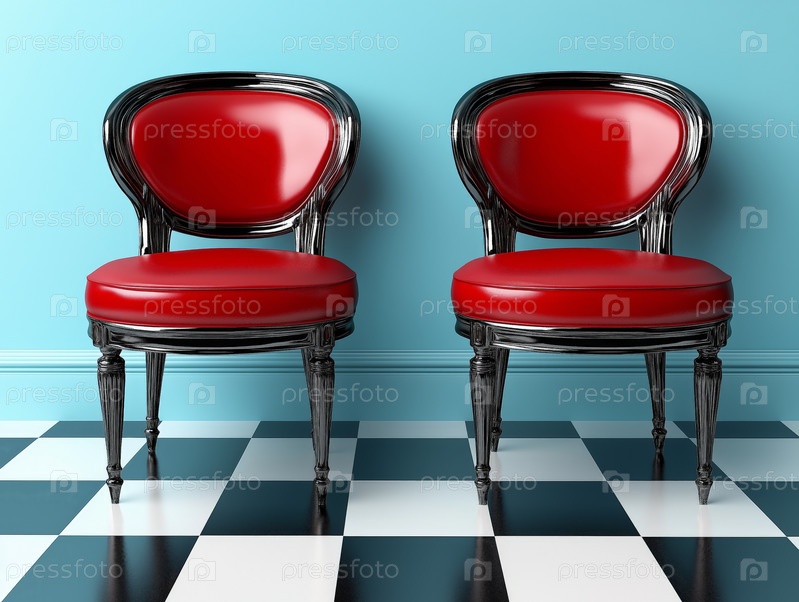 Два красных винтажных стула на черно-белом клетчатом полу