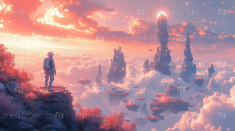 Астронавт смотрит на плавающие острова на фоне сюрреалистического заката