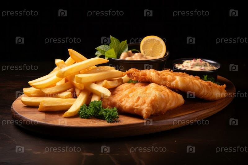 Блюдо из рыбы и чипсов на минимальной кухне. Домашняя или еда на вынос. Традиционная типичная британская еда. Картофель фри с соусом