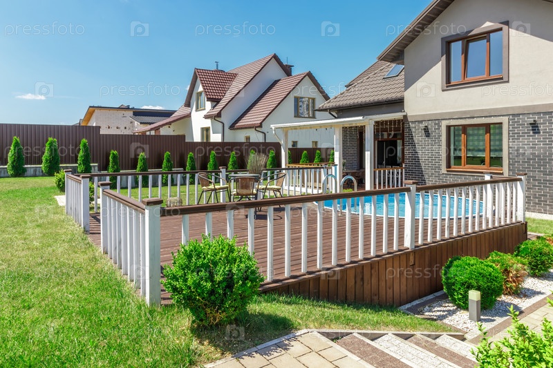 На фотографии изображен прекрасно благоустроенный задний двор с приподнятым бассейном, окруженным зеленью и удобной зоной отдыха