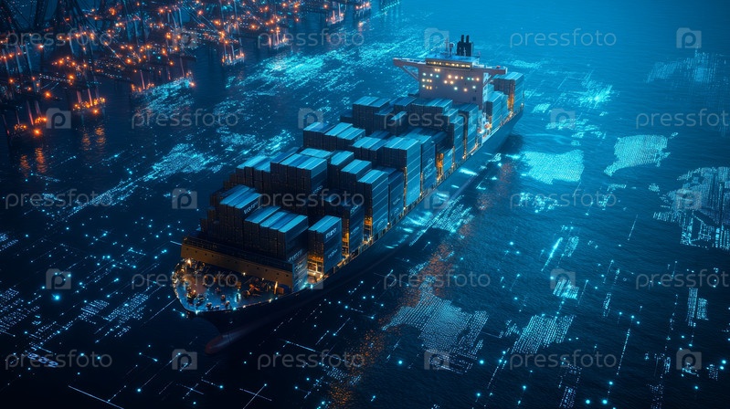 Огромное грузовое судно курсирует по оживленной гавани ночью, его разноцветные контейнеры отражаются в спокойной воде под сияющим горизонтом города