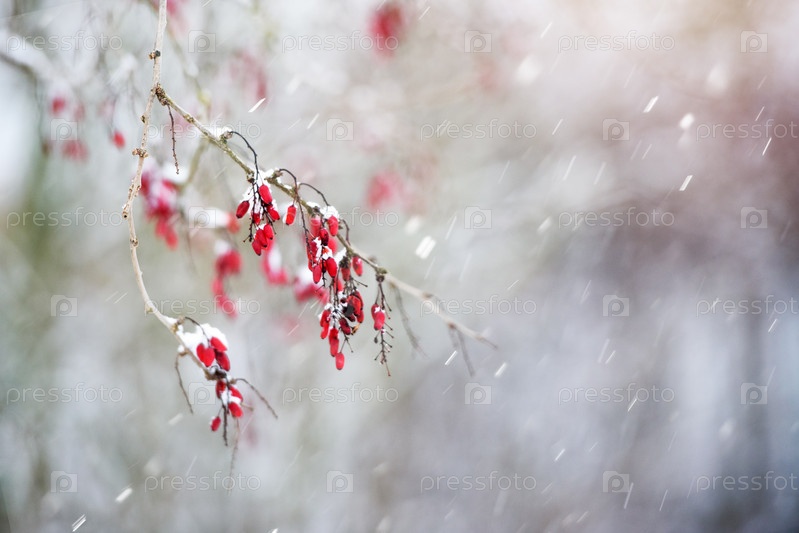 Красная ягода барбариса на ветке под снегом зимой