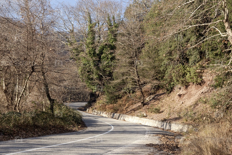 Живописное шоссе в высоких горах южного Пинда (Греция) в солнечный зимний день