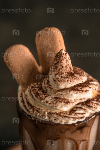 Крупный план взбитых сливок с печеньем «дамские пальчики» и какао. Мороженое молочный коктейль в высоком стакане со взбитыми сливками