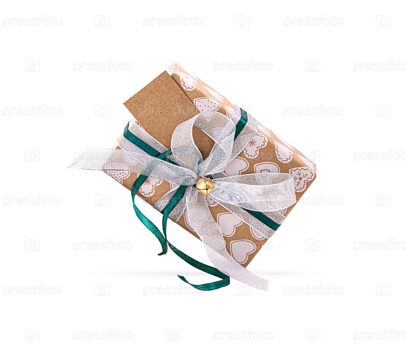Рождественская подарочная коробка изолирована на белом фоне. Подарочная коробка в упаковочной бумаге с зеленой и серебряной лентой