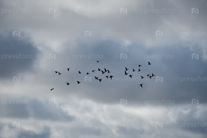 Россия. Республика Карелия. Стая водоплавающих птиц летят в теплые страны на зимовье на фоне осеннего пасмурного неба