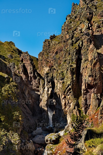 Россия, Приэльбрусье. Перепады горной реки Кызылкол с живописными долинами и водопадами у подножья высочайшей гору Кавказа - Эльбрус (5642 м)