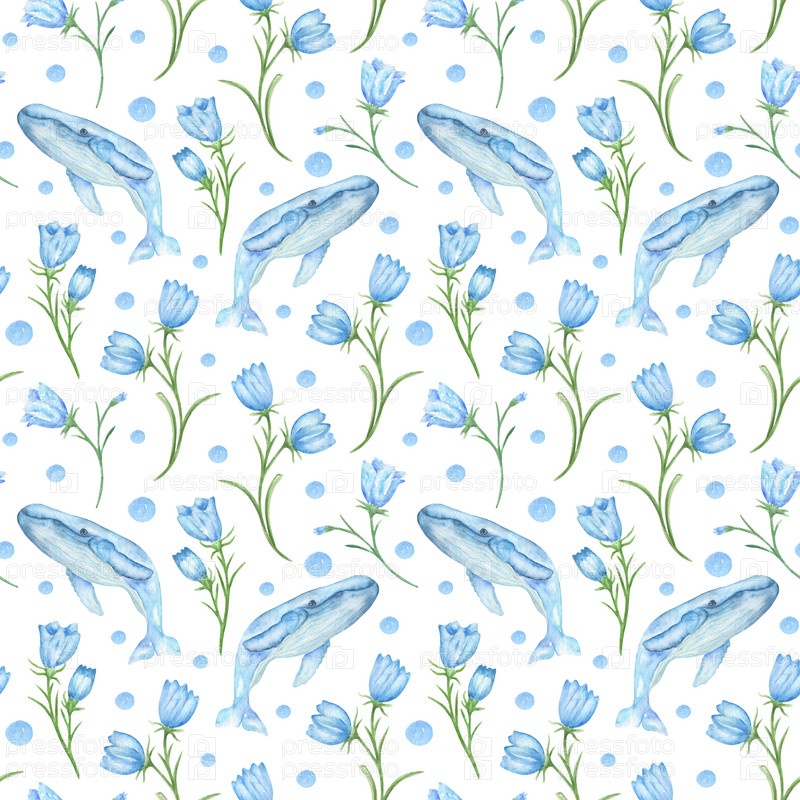Акварельный бесшовный узор с китами и колокольчиками, жизнью океана