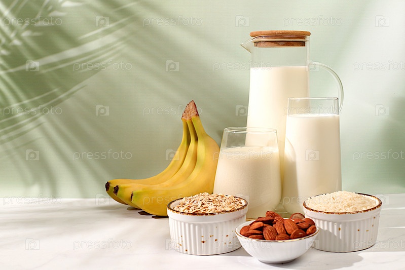 Банан, овес, рис и миндаль веганское альтернативное молоко без лактозы и глютена, без аллергии. Ассортимент веганских немолочных продуктов. концепция здорового питания потеря веса,