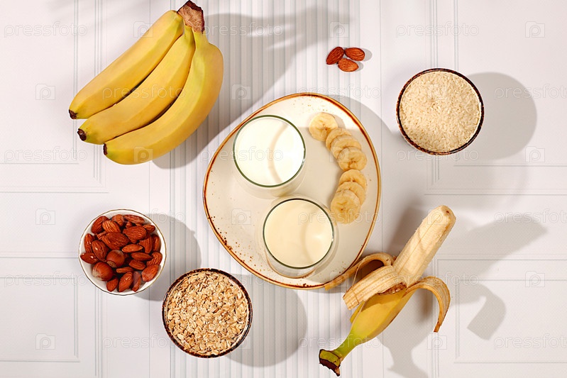 Банан, овес, рис и миндаль веганское альтернативное молоко без лактозы и глютена, без аллергии. Ассортимент веганских немолочных продуктов. концепция здорового питания потеря веса,