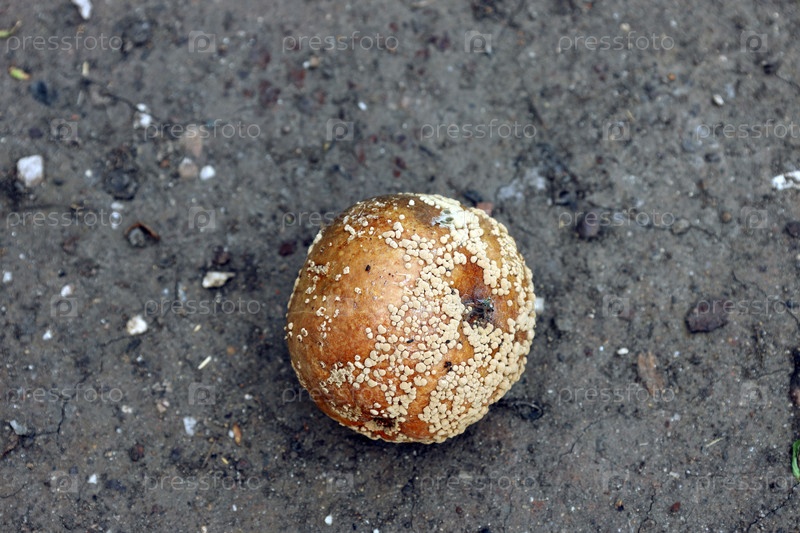 Яблоко, поврежденное плодовым гниением (лат. Monilinia laxa), лежит на земле
