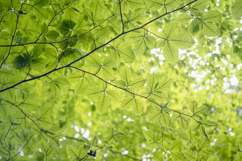 Ветви деревьев с зелеными листьями вид снизу размытый фон боке