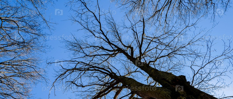 Ветви старых дубов, вид снизу, на фоне голубого неба