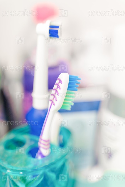 Зубные щетки на подставке в ванной крупным планом, размытый фон