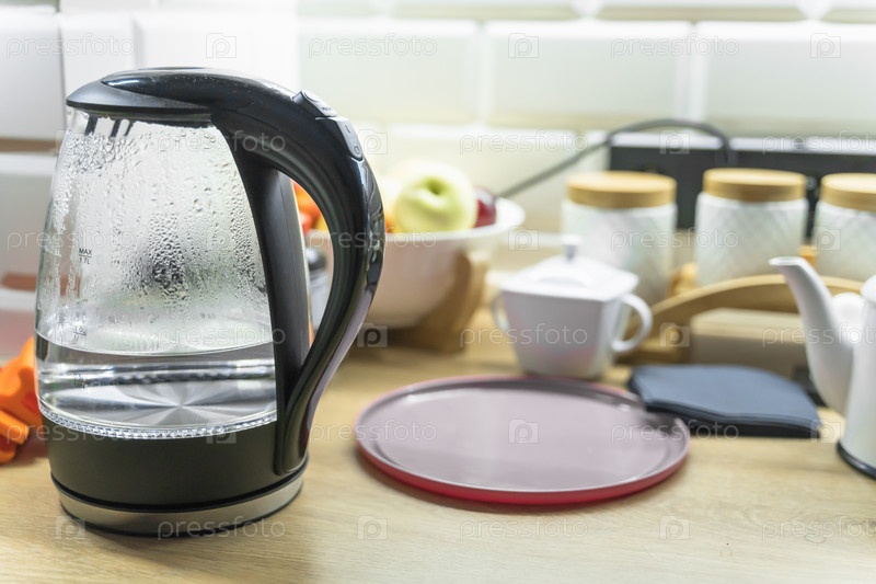 Электрический чайник стоит на кухонном столе