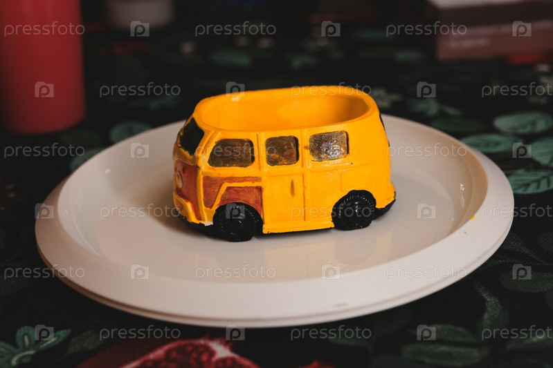 Яркий и веселый красочный желтый фургон, изображенный на элегантной тарелке для создания художественного эффекта