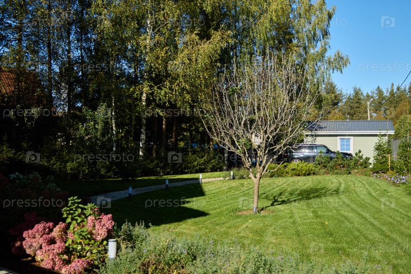 Прекрасный сад с яркими цветами и ухоженным газоном, располагающий к отдыху